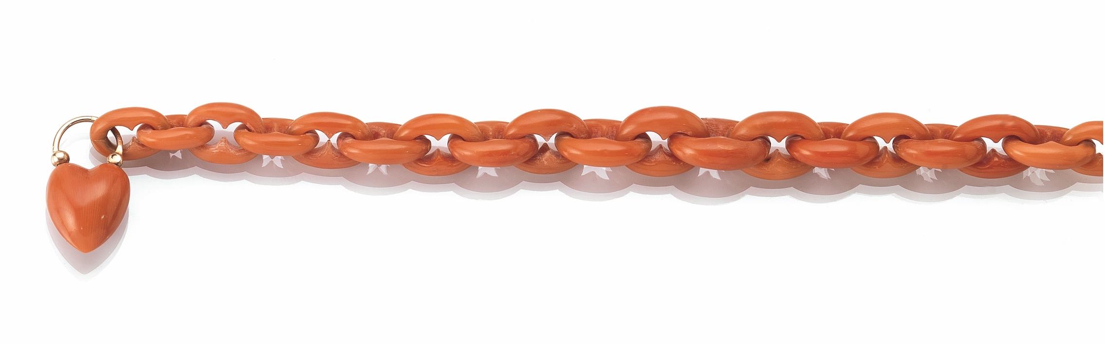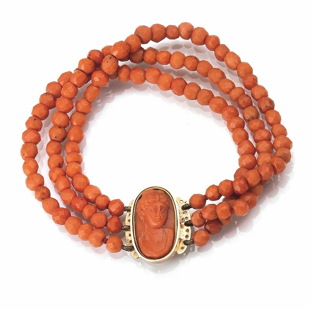 uno composto da tre fili con fermatura in oro giallo e corallo intagliato a