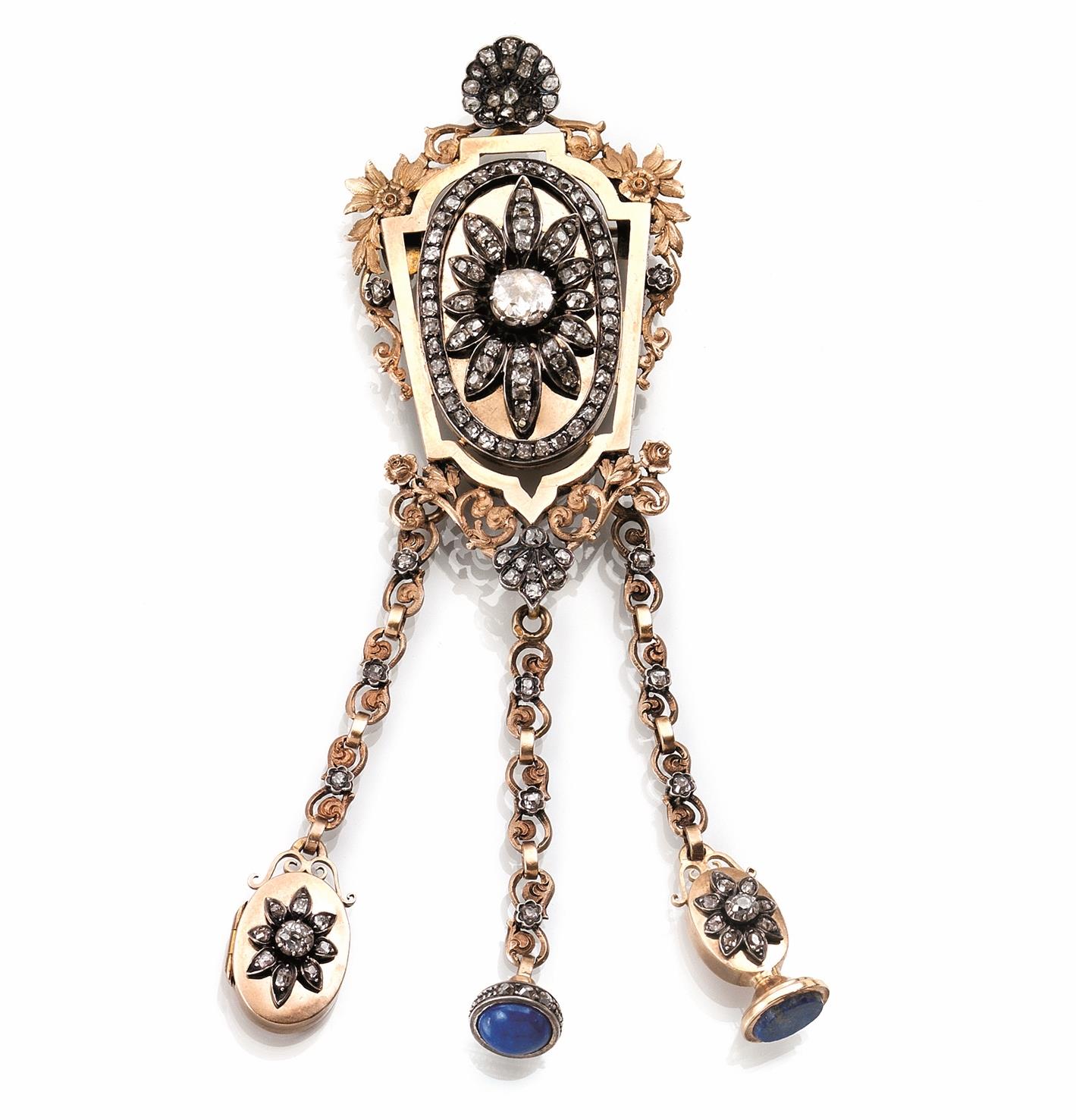 Spilla pendente, in oro rosa, argento e diamanti parte di un devant de...