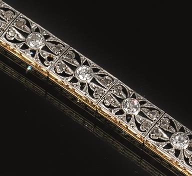 Bracciale, inizi sec. XX, in oro giallo, oro bianco e diamanti