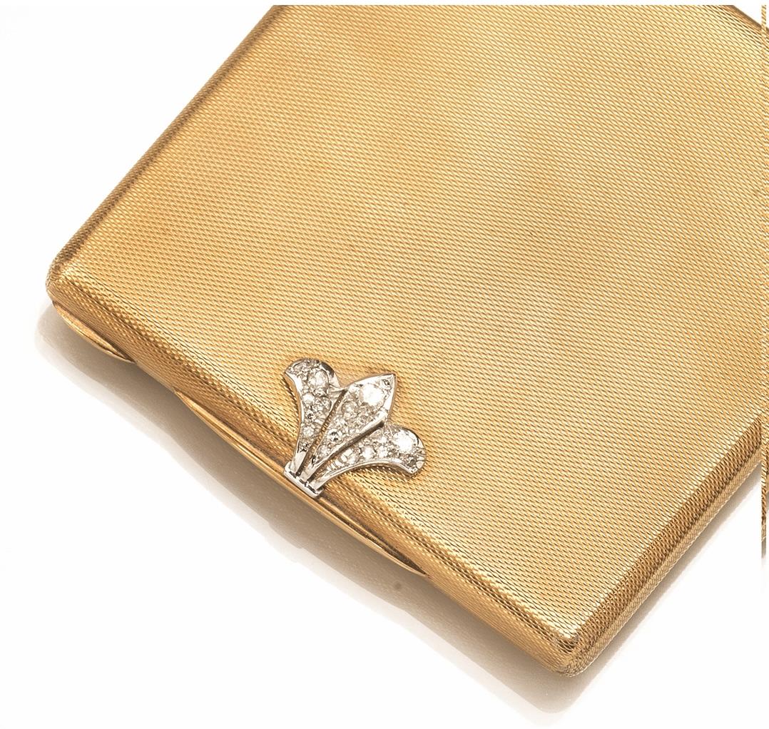 Scatola portacipria in oro giallo, oro bianco e diamanti