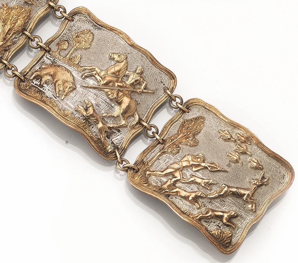 realizzato ad una fila di quattro placche raffiguranti scene di caccia, punzoni 750 e Torrini firmato Roberto Dughetti, g 75