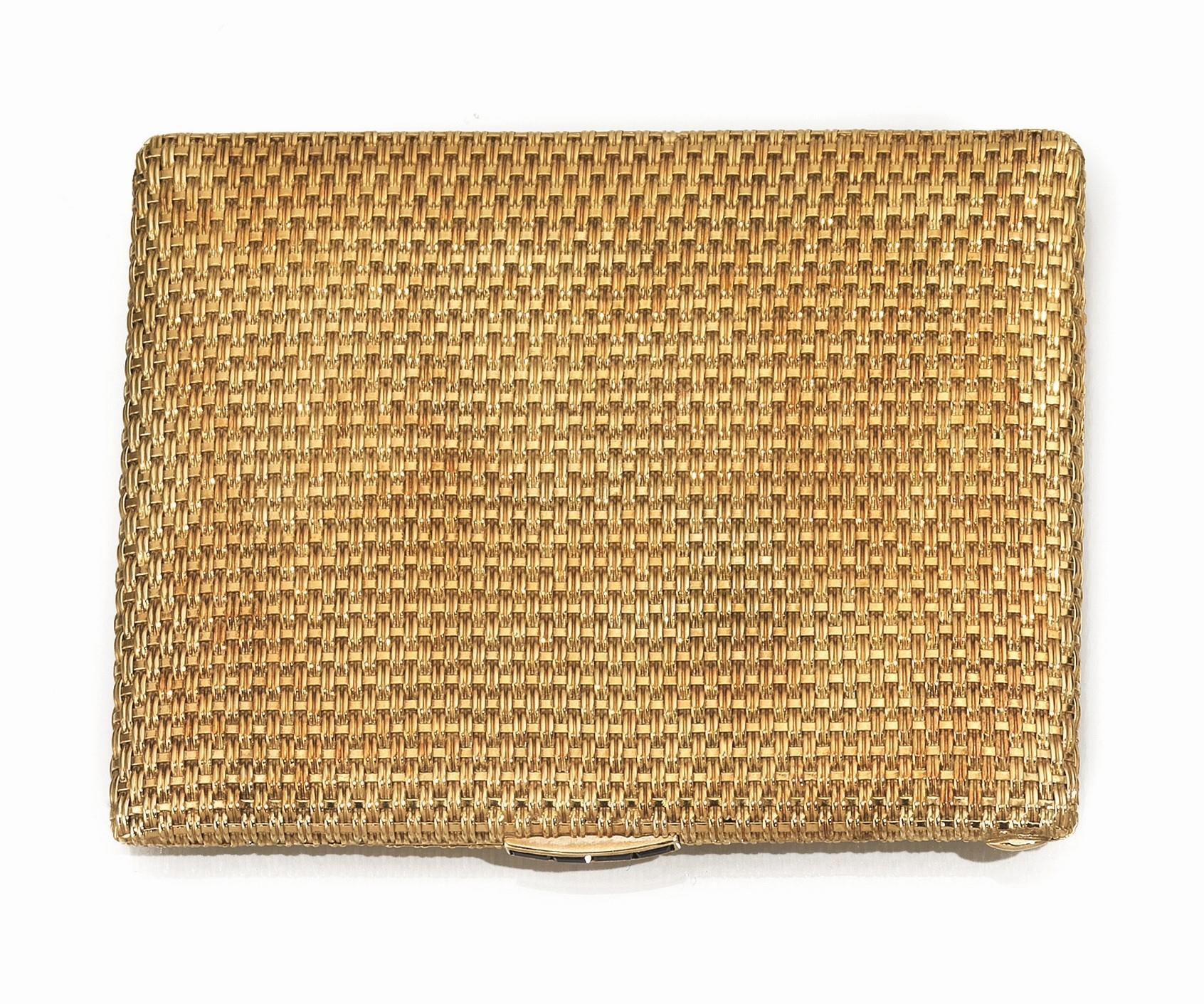Portasigarette, 1955, in oro giallo e zaffirilavorato a effetto tessuto con...