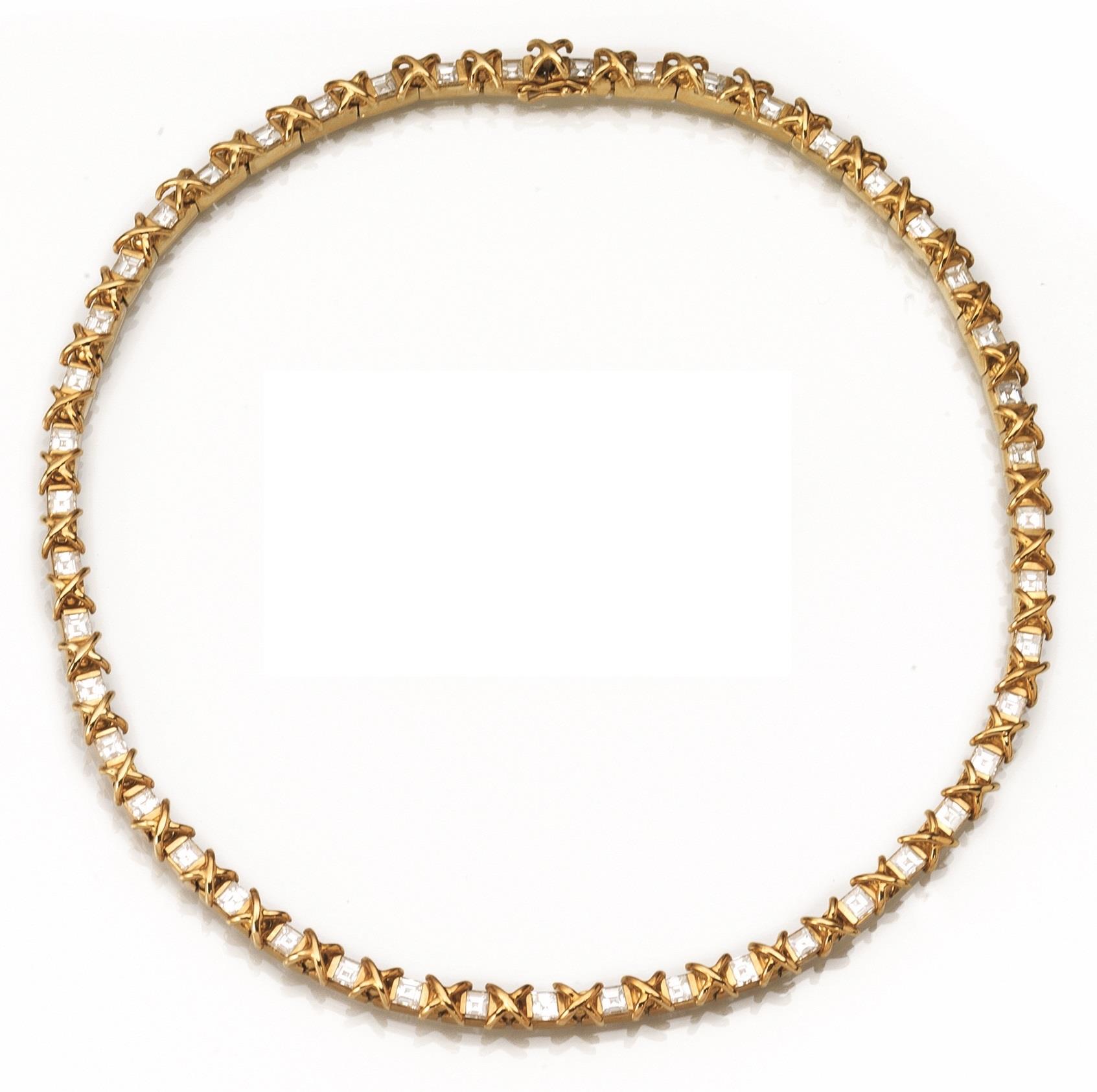 realizzata ad una fila di diamanti quadrati taglio a gradini intercalati da maglie bombate in oro giallo a croce, punzone 750, g 69