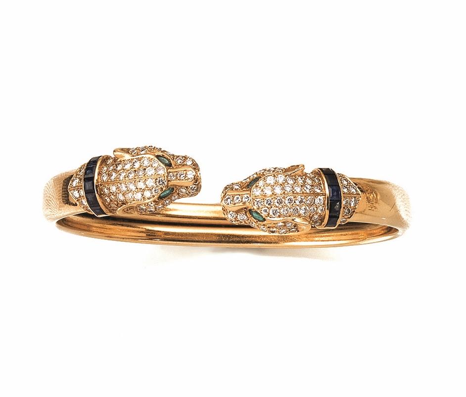 realizzato a cerchio rigido con due teste di pantera interamente decoratein brillanti, collari in zaffiri carre e occhi in smeraldi marquise, g 27