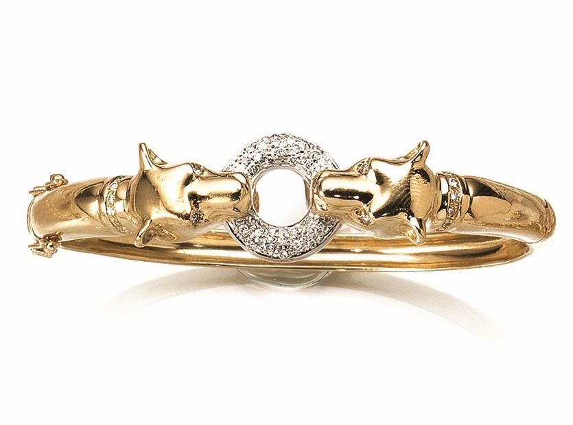 realizzato a cerchio rigido decorato nella parte anteriore con teste di pantera lunite da un anello, il tutto impreziosito da brillanti, punzone 750, g 37
