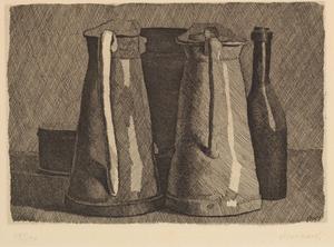 Giorgio Morandi Bologna 1890 - 1964 Natura morta con cinque oggetti, 1956 Acquaforte su rame, es. 119/150, cm. 14x19,9 (lastra), cm. 38,8x49,6 (carta) Firma in lastra in basso a sinistra: Morandi, data in basso a destra: 1956, firma a matita sul margine in basso a destra: Morandi, in basso a sinistra tiratura: 119/150. Terzo stato su quattro. Tiratura di 150 esemplari numerati da 1 a 150 per l'Associazione Amatori d'Arte, Roma e di 15 esemplari numerati da I a XV per l'artista. Bibliografia: Lamberto Vitali, L'opera grafica di Giorgio Morandi, Giulio Einaudi Editore, Torino, 1964, n. 116; Michele Cordaro, Morandi incisioni. Catalogo Generale, Edizioni Electa, Milano, 1991, p. 134, n. 1956 1.