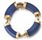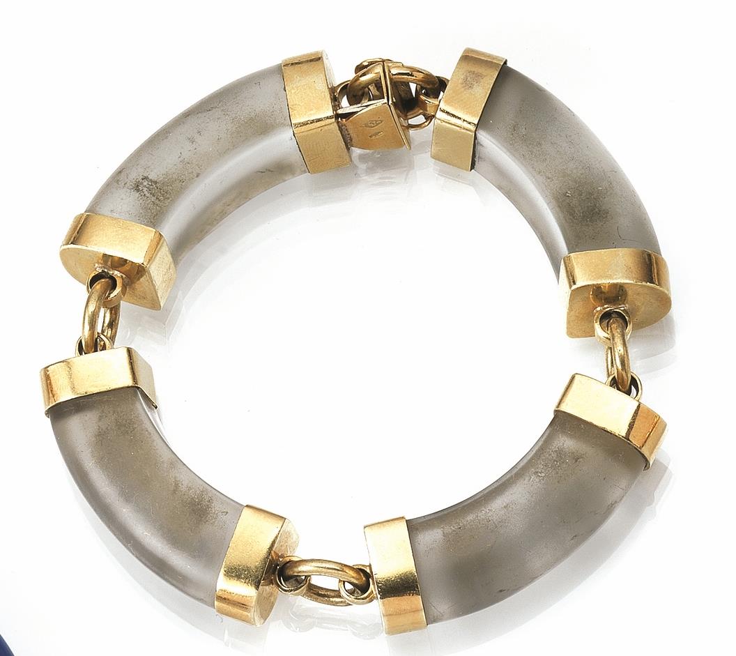 un bracciale formato da segmenti curvi in cristallo di rocca satinato uniti da anelli in oro giallo; l'altro realizzato allo stesso modo in calcedonio blu, g 145 complessivi, lievi danni