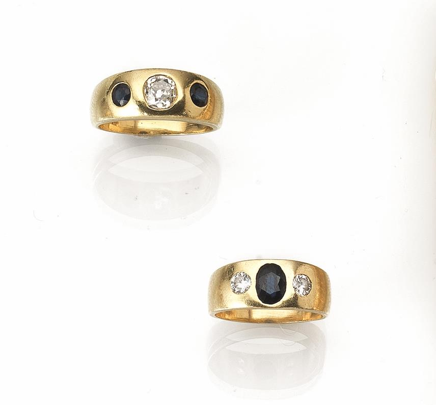 Coppia di anelli in oro giallo con zaffiri e diamanti