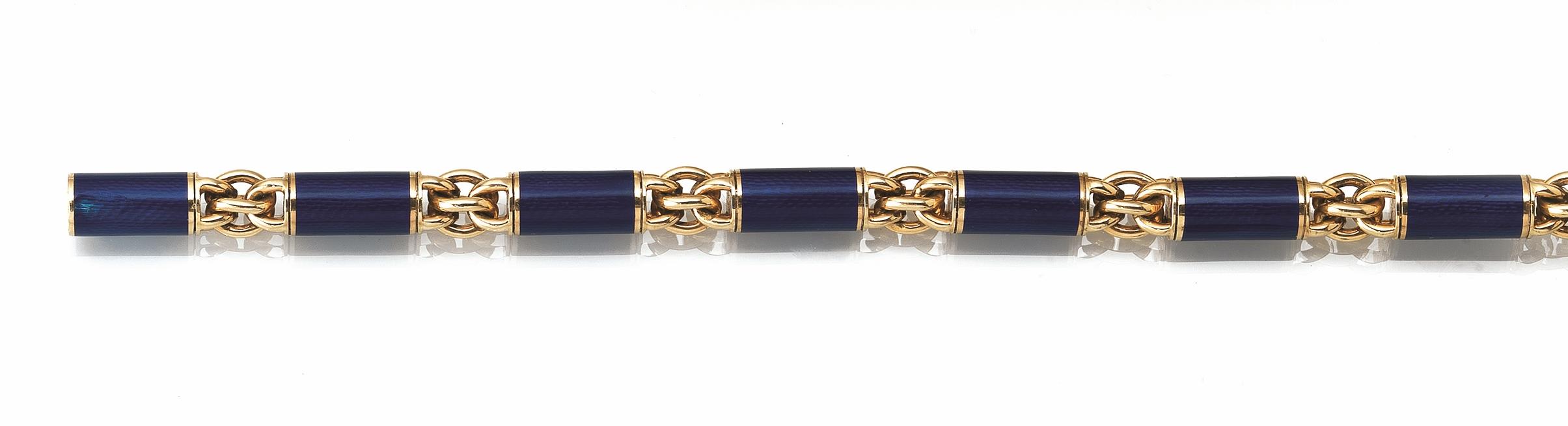 realizzato ad una fila di otto barilotti in oro giallo rivestiti in smalto blu alternati a maglie ad anello concatenate, punzone 750, g 81, alcuni danni allo smalto