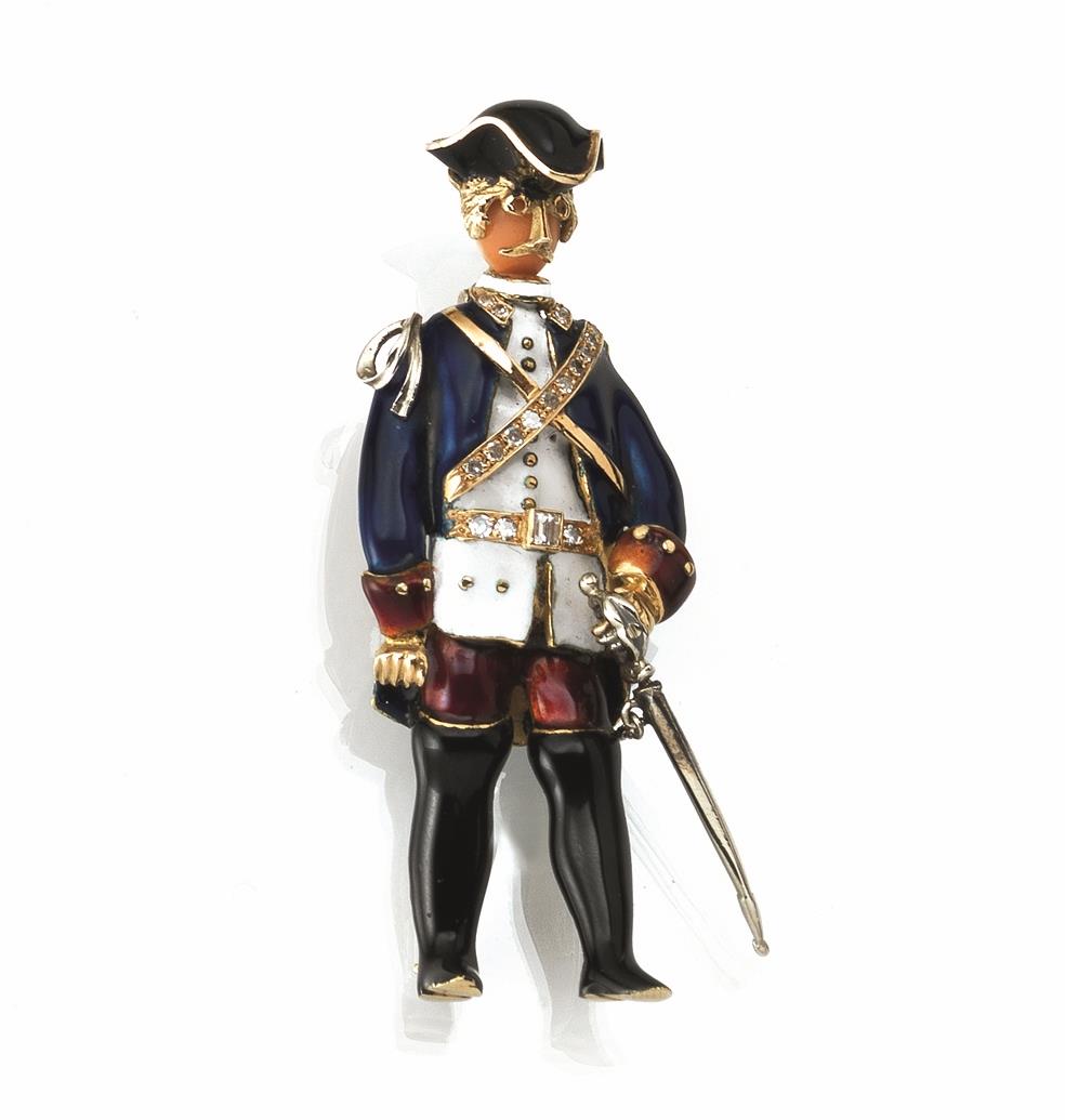 Spilla in oro giallo, diamanti, corallo e smaltimodellata a soldatino con...