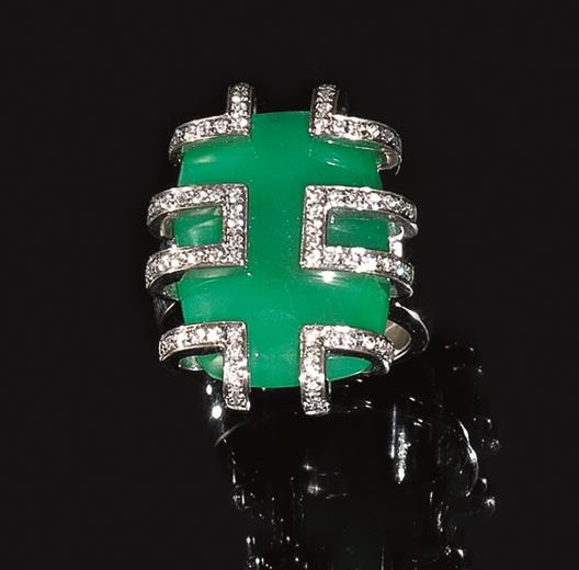 con calcedonio crisoprasio rettangolare cabochon entro struttura geometrica a gabbia impreziosita da brillanti, punzone 750, g 18