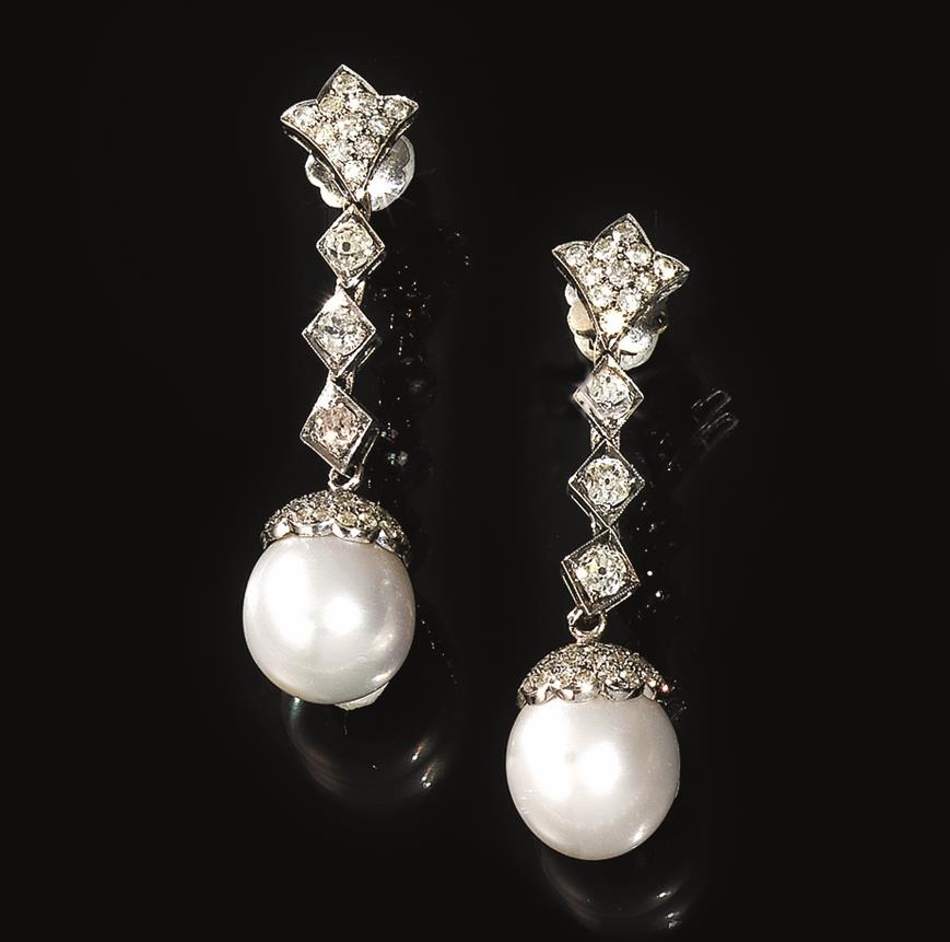 ciascuno realizzato con pendente in diamanti di taglio vecchio entro castoni romboidali e finale in perla con coppiglia decorata da un pave di brillanti, g 18