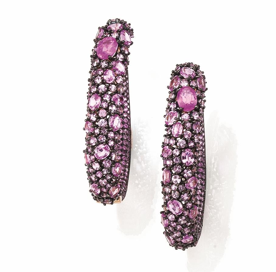 Paio di orecchini in oro rosa e zaffiri rosaciascuno realizzato come un...