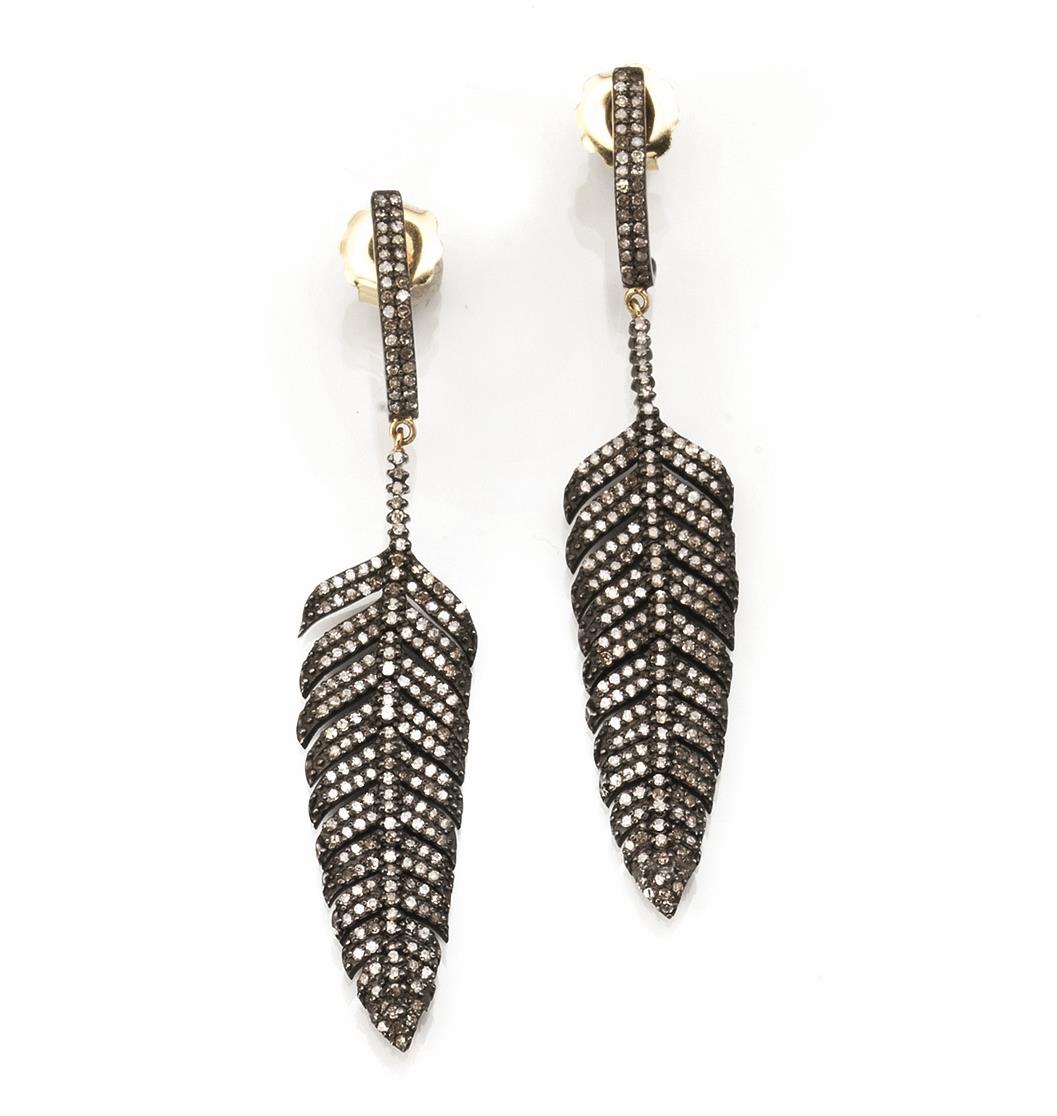 ciascuno disegnato come una doppia linea di brillanti a cui è sospesa una piuma realizzata a maglia snodabile interamente decorata in brillanti per ct 2.67, punzone 14 kt, g 14