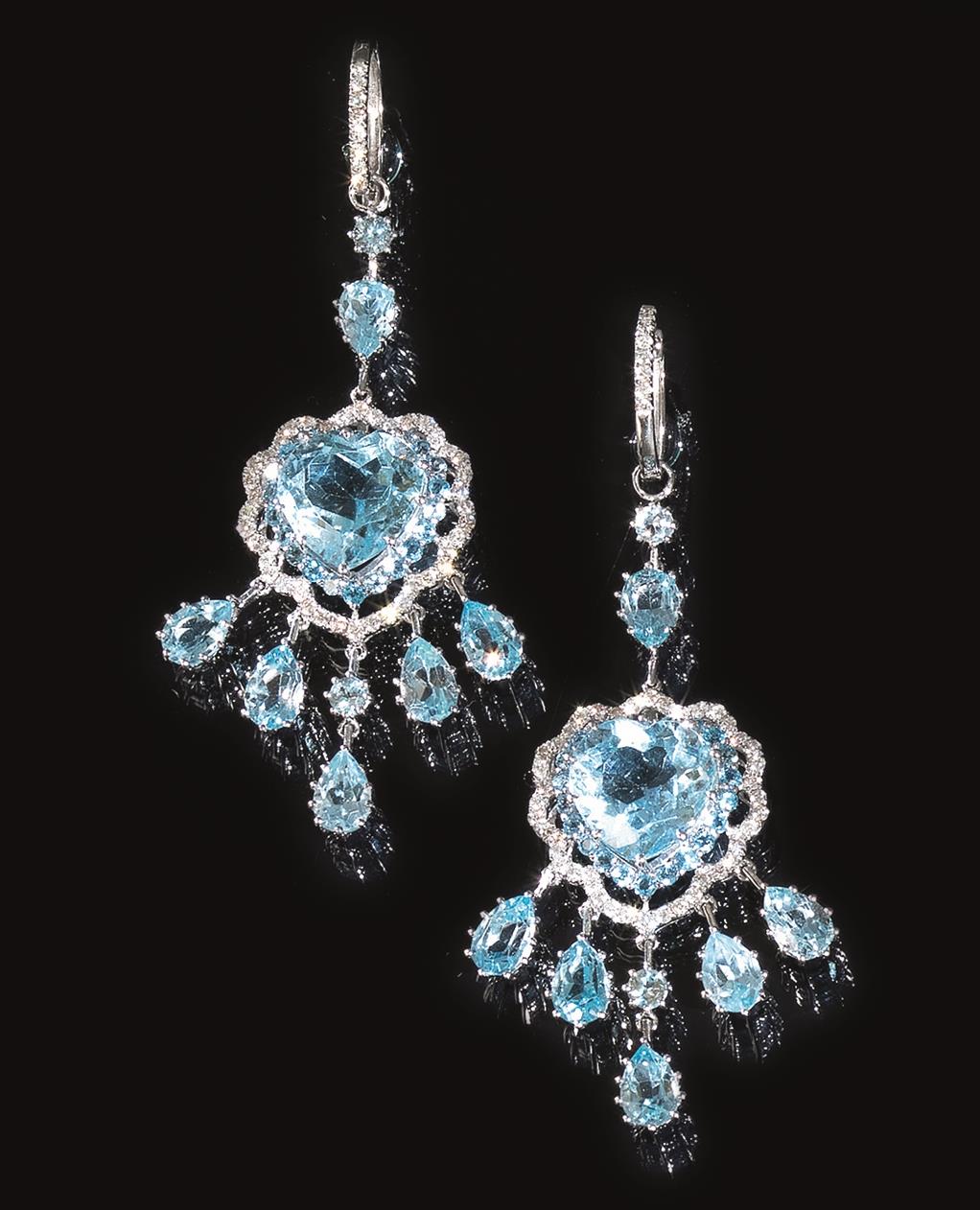 Paio di orecchini pendenti in oro bianco, diamanti e topazi azzurri