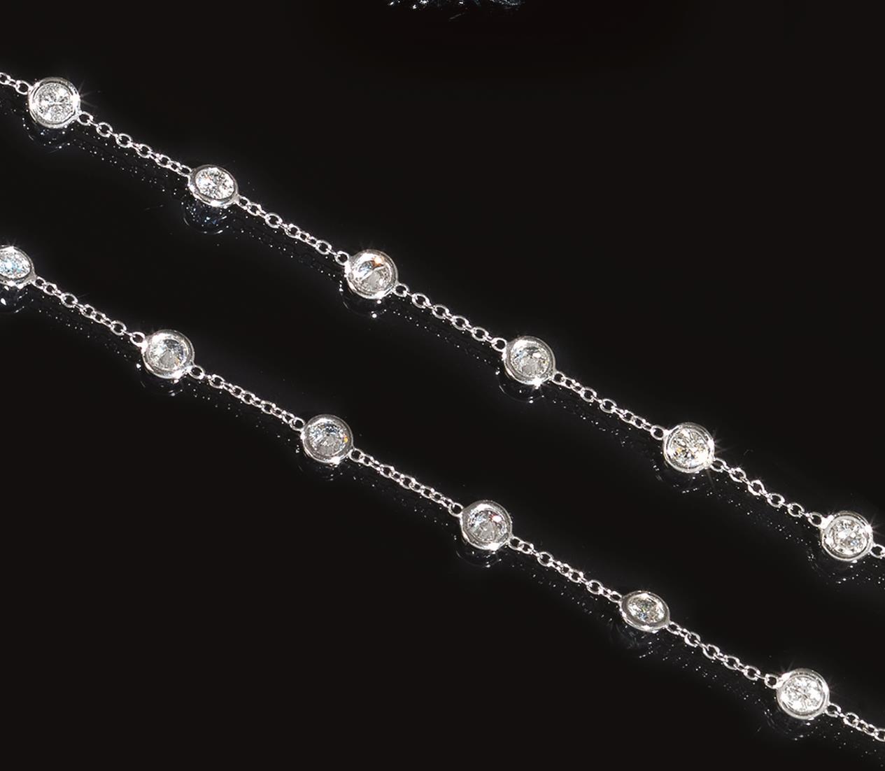 realizzata con una catena a maglia sottile lungo cui si intercalano cinquantatrè brillanti montati entro castone circolare per ct 12.61, g 14