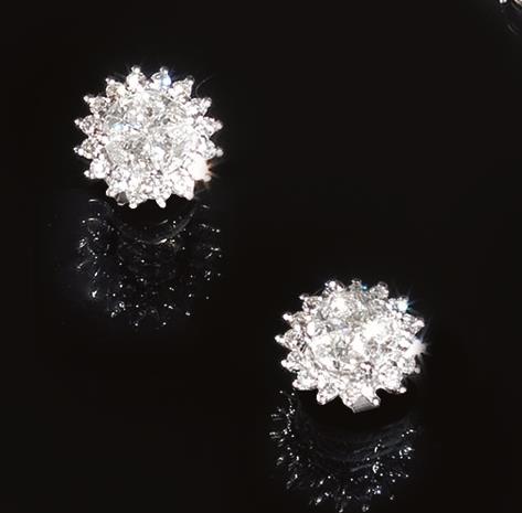 ciascuno formato da quattro brillanti a spicchio montati a formare un cerchio entro una cornice in brillanti per ct 1.83, punzone 750, g 4