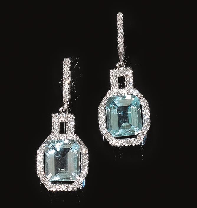 Paio di orecchini pendenti in acquamarina e diamanticiascuno realizzato con...