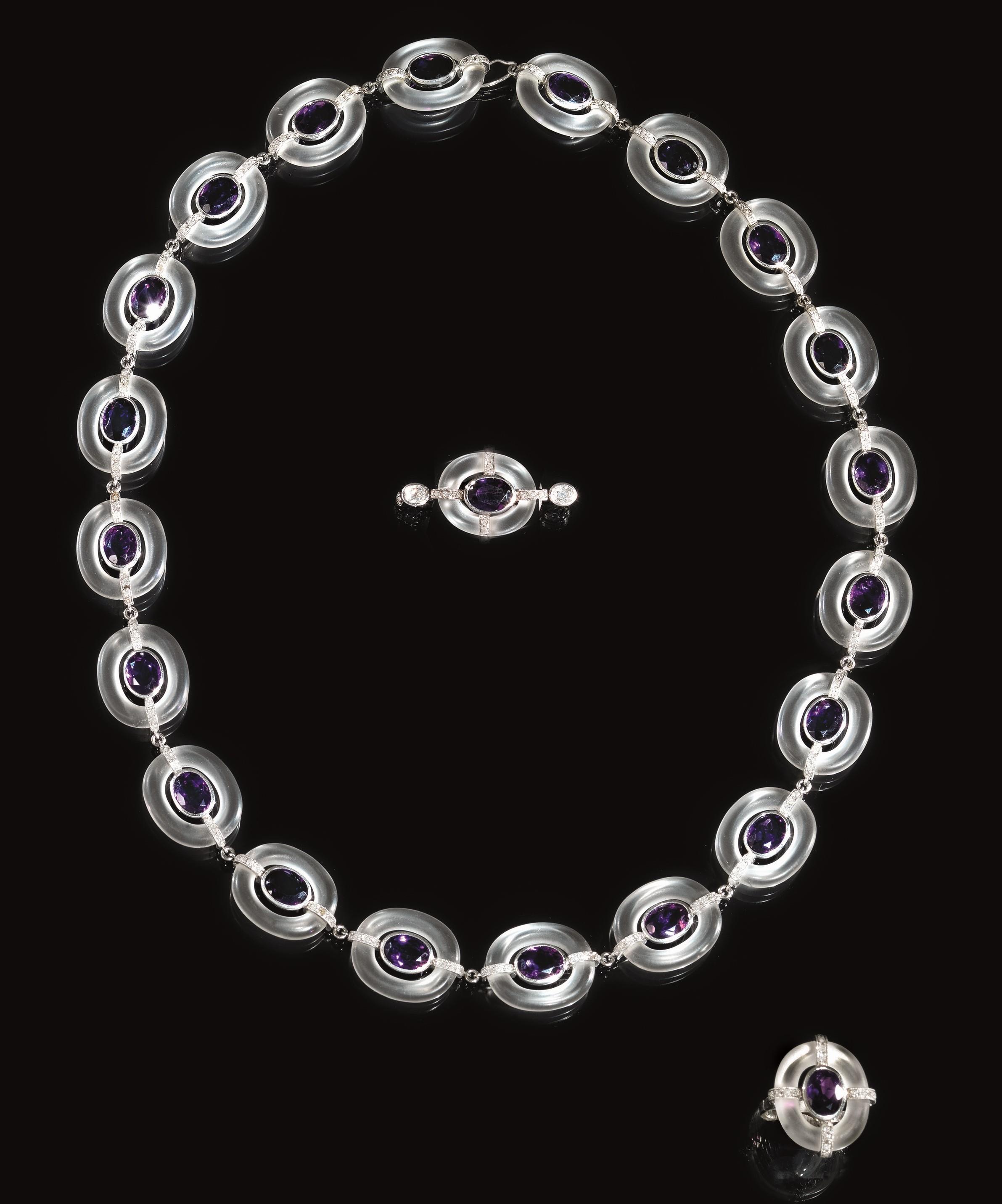 la collana realizzata ad una fila di elementi ovali in cristallo di rocca satinato decorato da un'ametista centrale e due linee di brillanti; l'anello in platino cesellato en suite con la collana, punzone Cartier London; la spilla con brillanti taglio vecchio en suite alla collana, g 87 complessivi, entro scatola