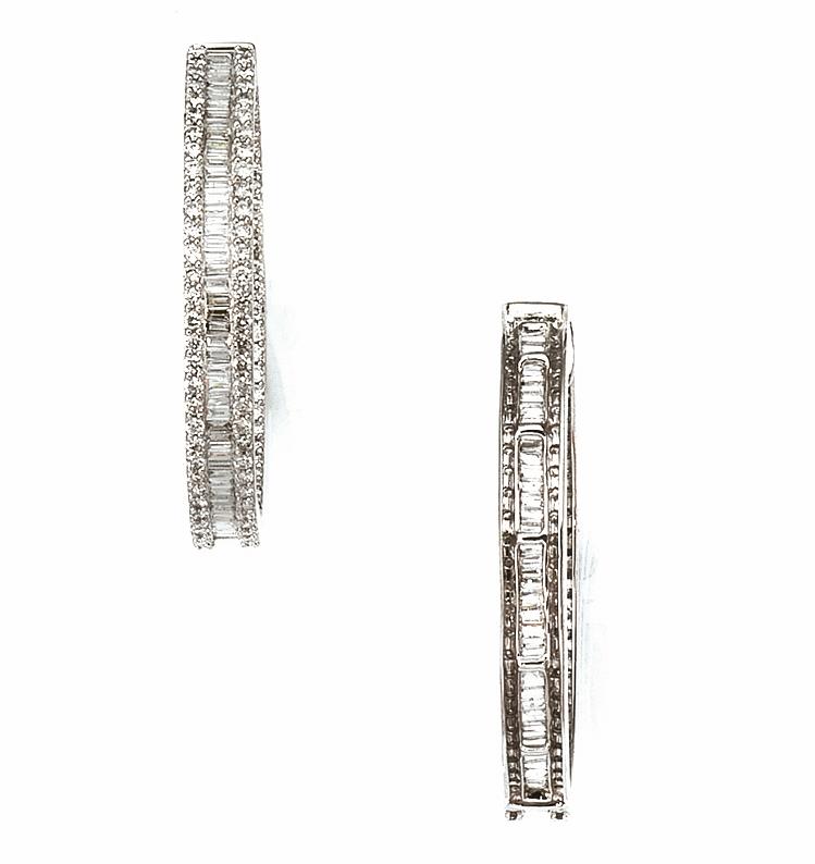 ciascuno realizzato come un cerchio decorato nella parte anteriore e nella parte interna posteriore da una linea di baguette entro due file di brillanti per ct 4.30, punzone 750, g 13