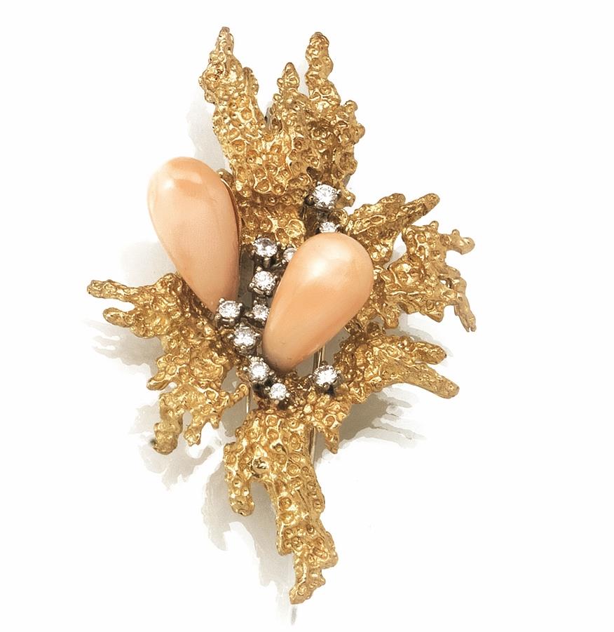 Spilla in oro giallo, corallo e diamanti disegnata come un tralcio floreale...