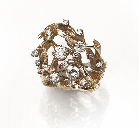 modellato come un intreccio di rami cesellati impreziositi da brillanti, punzone 14 kt, g 15