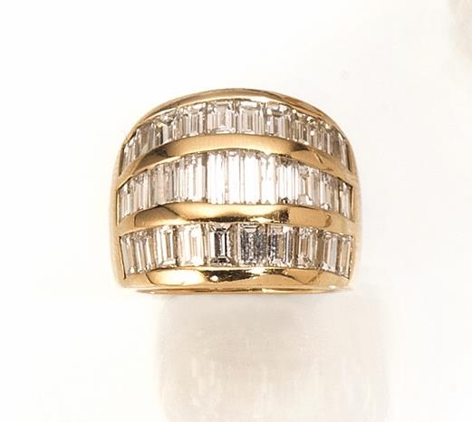 Lotto 237 | Anello in oro giallo e diamanti modellato a tre linee di baguette ct 5.87...
