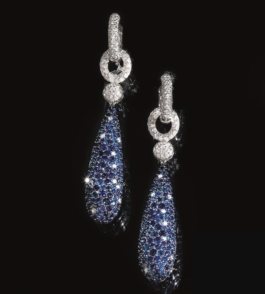 Paio di orecchini pendenti in oro bianco, diamanti e zaffiri