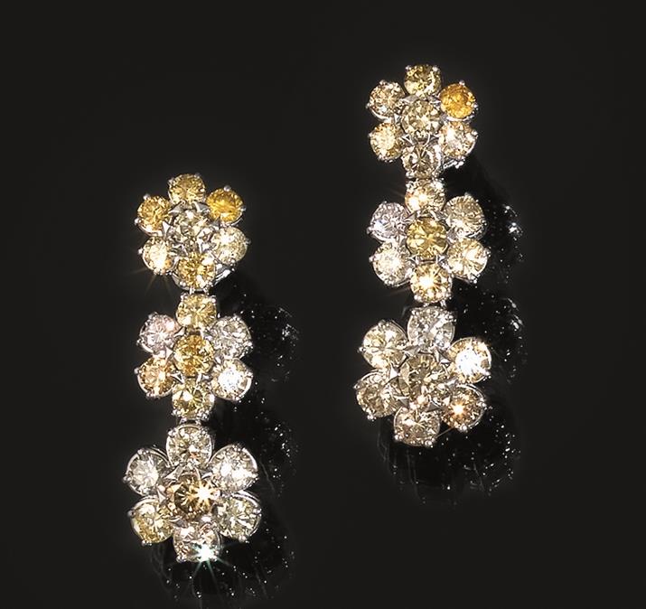 ciascuno formato da tre corolle poste in gradazione interamente decorate in diamanti fancy e incolori per ct 8.76 complessivi, punzone 750, g 14