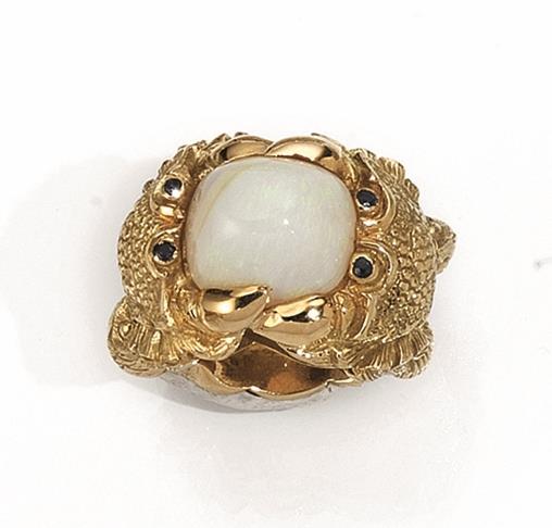 Anello, Serafini, in oro giallo, opale e zaffirimodellato come una coppia di...