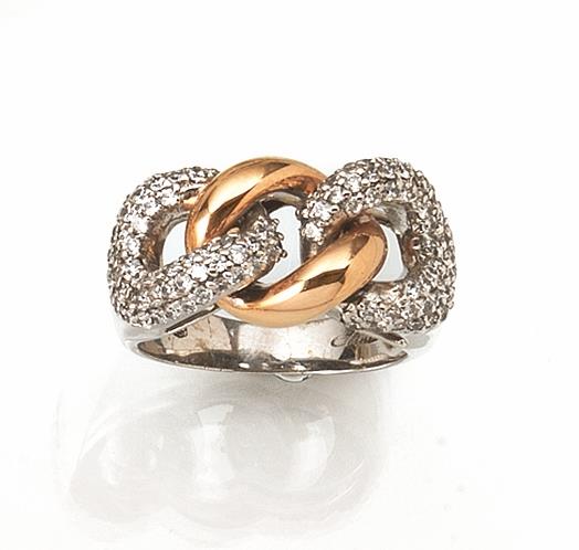 Anello in oro bianco, oro rosa e diamantial centro tre maglie barbazzale in...