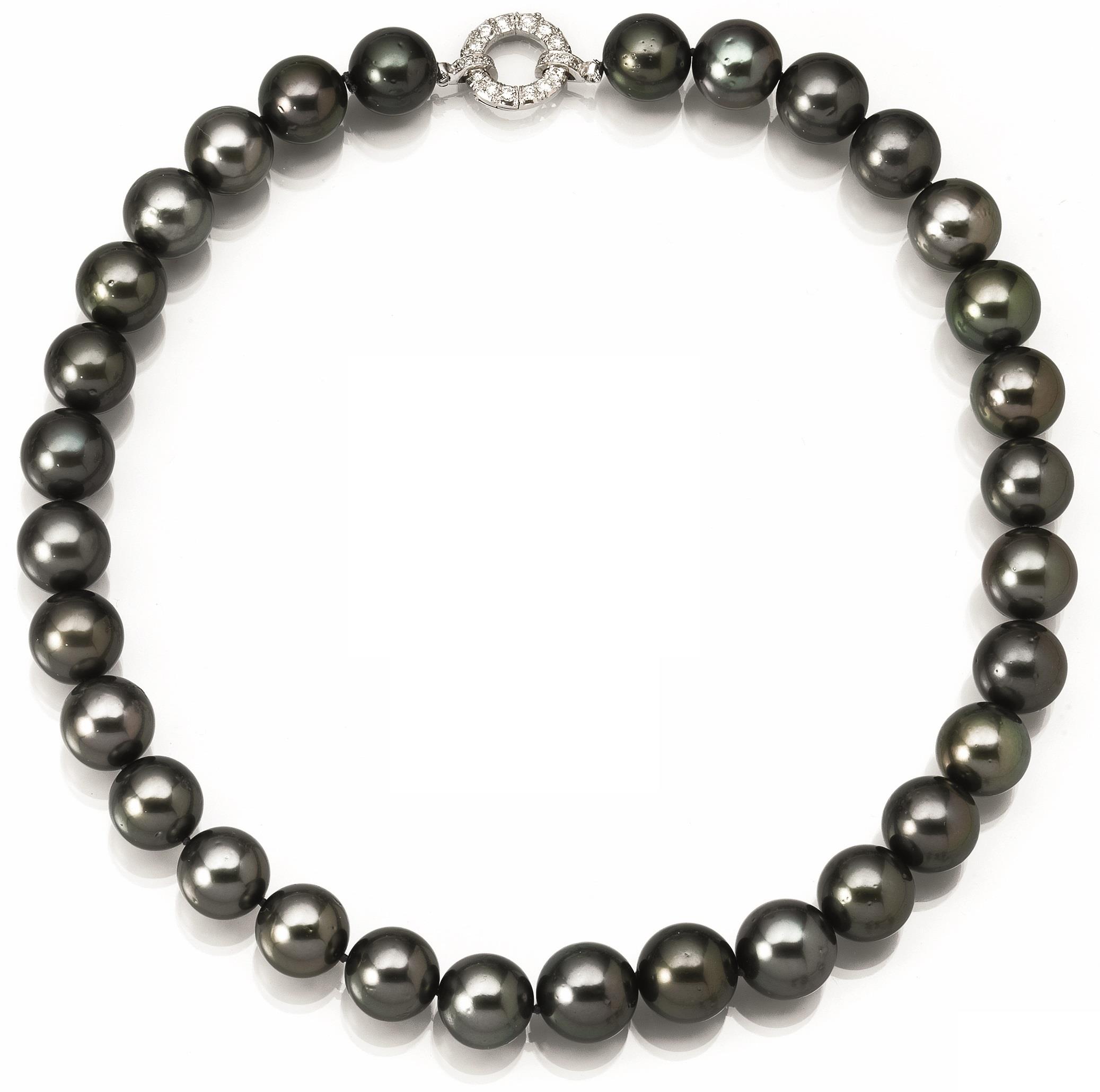 realizzata ad un filo di perle Tahiti diam. da mm 14.5 a mm 11, fermatura ad anello decorata in brillanti, g 121