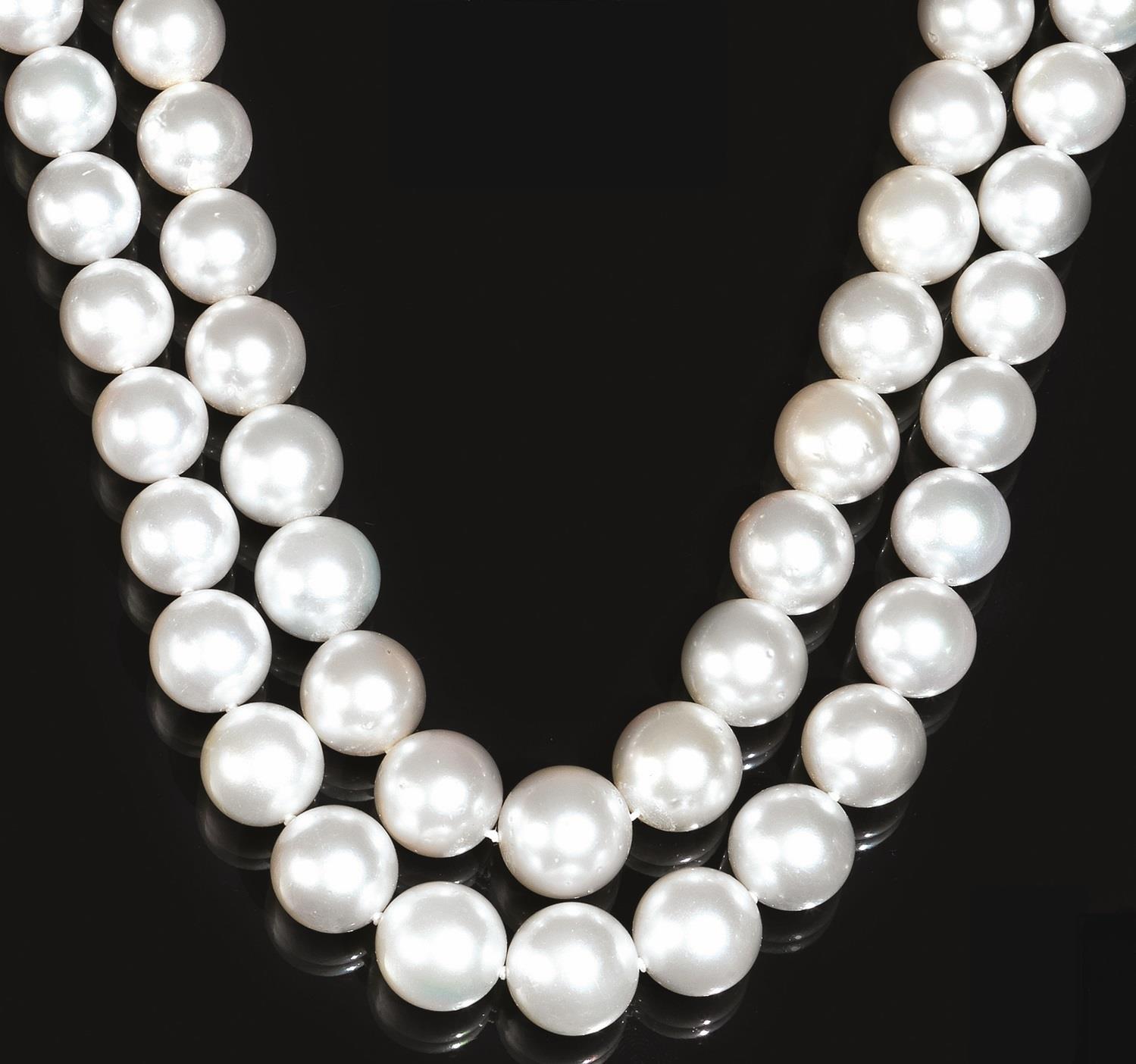realizzata a due fili di sessantaquattro perle australiane poste in lieve gradazione, diam. da mm 11 a mm 14.9, fermatura ovale in oro bianco traforato e cesellato a foglie decorata da brillanti, g 211