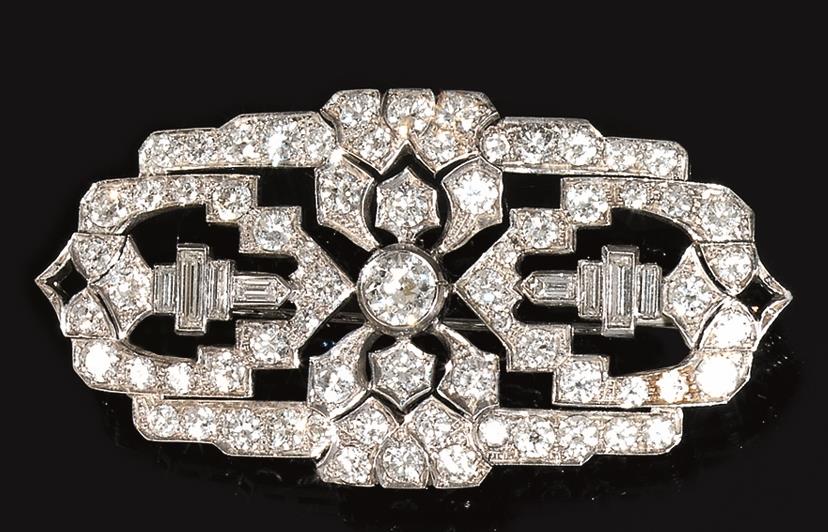 Lotto 317 | Spilla, periodo deco, in oro bianco e diamanti modellata come una placca...