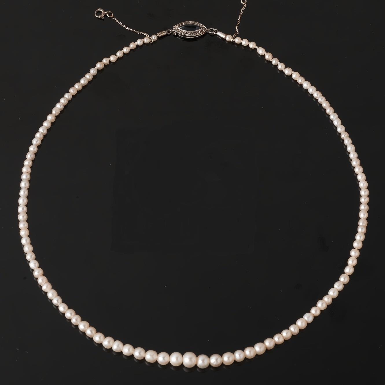 modellata ad una fila di perle diam. da mm 2.5 a mm 6.50 con fermatura in oro bianco decorato da rose di diamanti e zaffiro cabochon, g 11. Corredato di certificato gemmologico CISGEM n. 84923, datato 24/10/2014