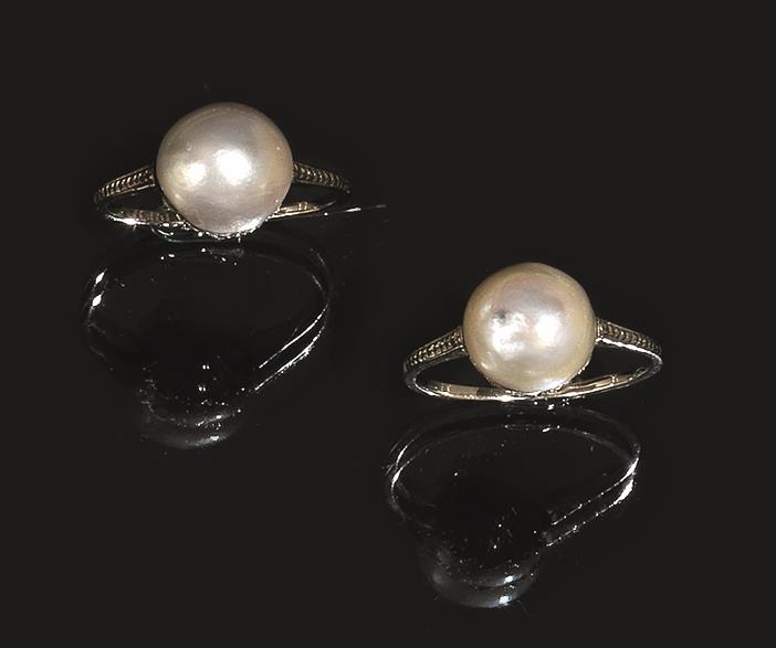Due anelli in oro bianco, perle naturali e diamanticiascuno realizzato con...