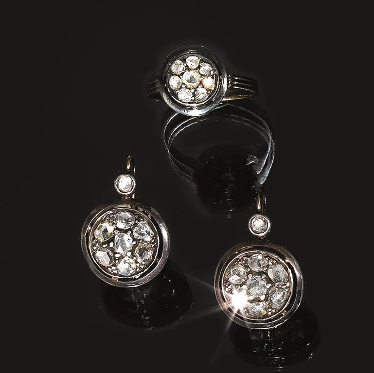 Demi-parure, fine sec. XIX, in oro giallo, argento e diamanti, composta da paio di orecchini ed anello