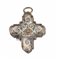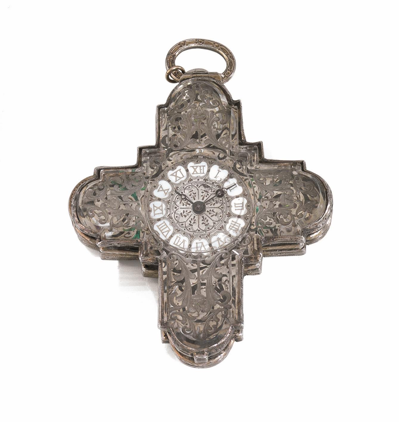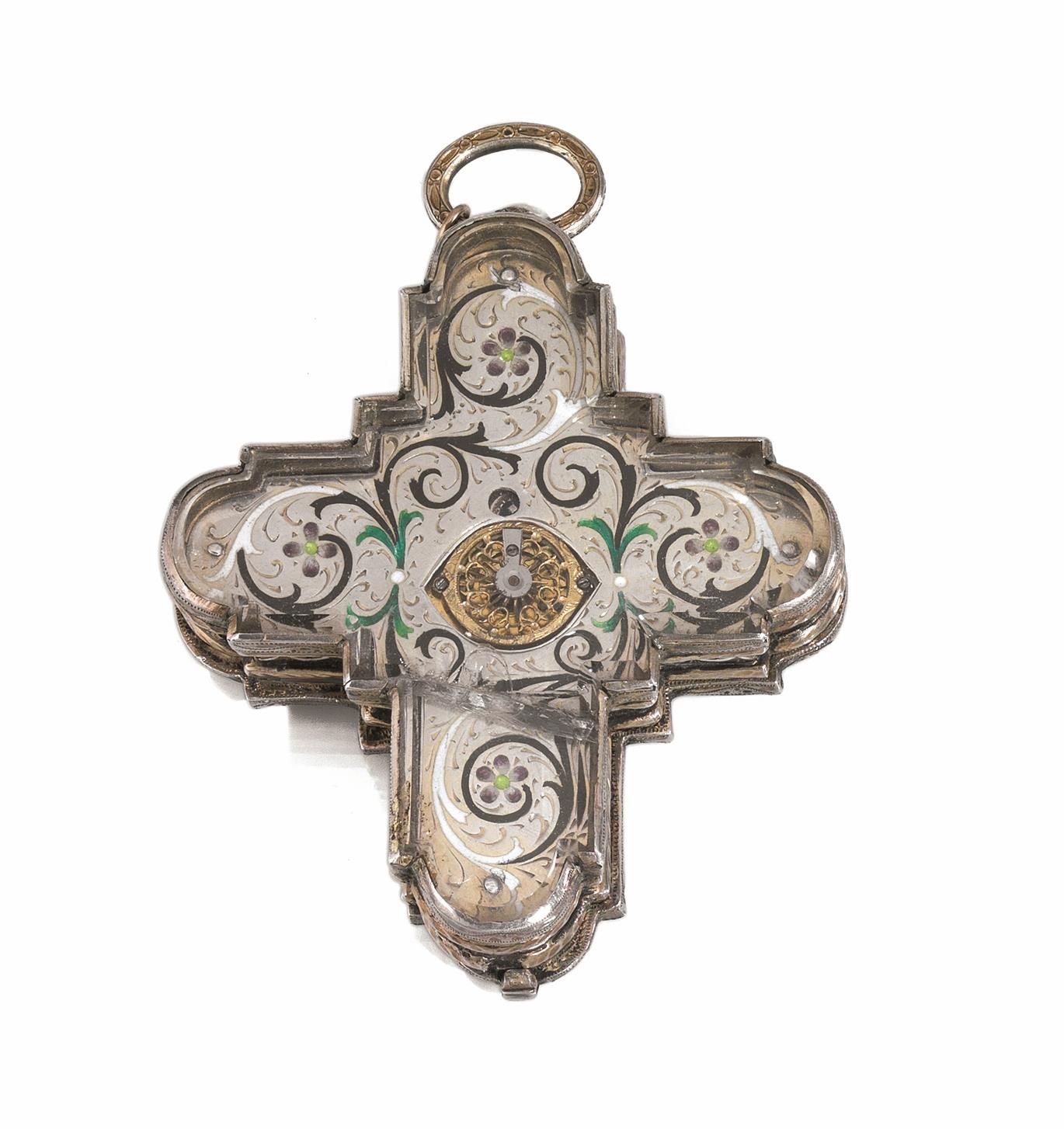 Cassa in cruciforme in argento interamente cesellato a volute fogliacee e corolle parte delle quali decorate in smalto verde, nero e bianco, fronte e retro in cristallo molato inciso a volute vegetali. Quadrante circolare inserito al centro della croce in argento cesellato a palmette e volute, numeri romani entro riserve sagomate in smalto bianco, lancette traforate. Movimento con scappamento a verga, carica e rimessa delle ore a chiavetta. Dim. cm 8,5x7,3
