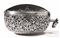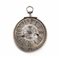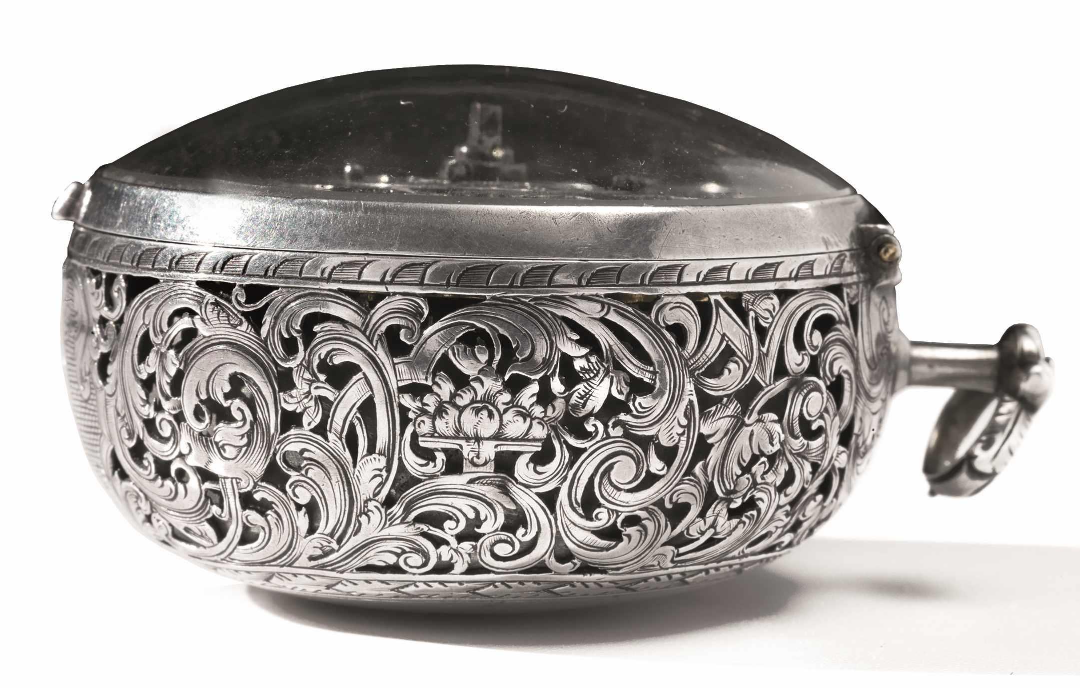 Cassa in argento traforato e cesellata a volute fogliacee e teste di draghi, riserva centrale circolare in argento liscio con corolla incisa al centro. Quadrante in argento con numeri romani intercalati da corolle, piccolo disco concentrico per la sveglia con punta indicatrice dell'ora. Movimento con scappamento a verga, carica e rimessa delle ore con chiave a catena. Diam. mm 47
