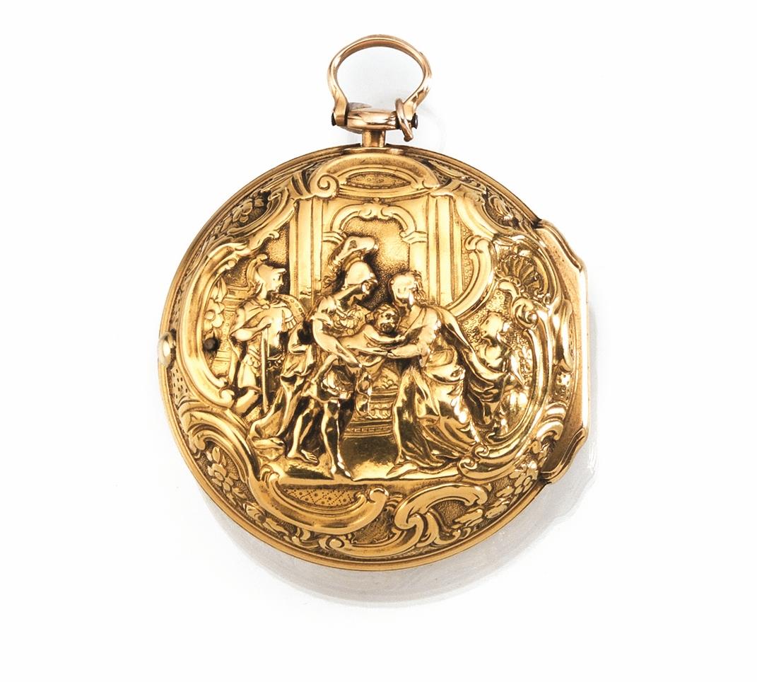Cassa in oro giallo liscio, controcassa sbalzata con raffigurazione de La Strage degli Innocenti entro riserva sagomata a volute architettoniche e fogliacee. Movimento con scappamento a àncora laterale, carica e rimessa delle ore a chiavetta. Diam. mm 48