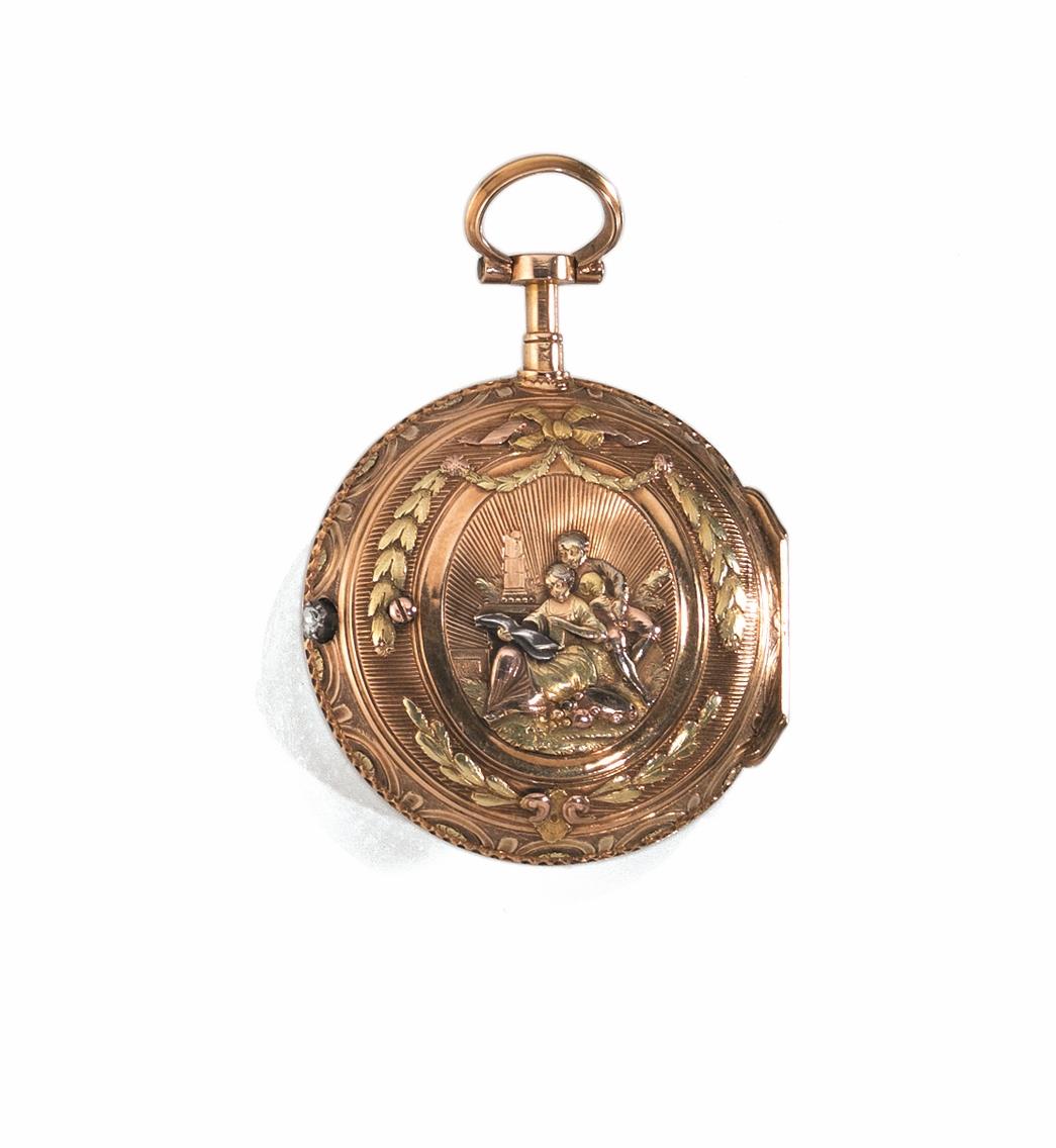 OROLOGIO DA TASCA, HERBAU A PARIS, 1780 CIRCA, IN ORO GIALLO, ORO ROSA, ORO BIANCO E ROSE DI DIAMANTE