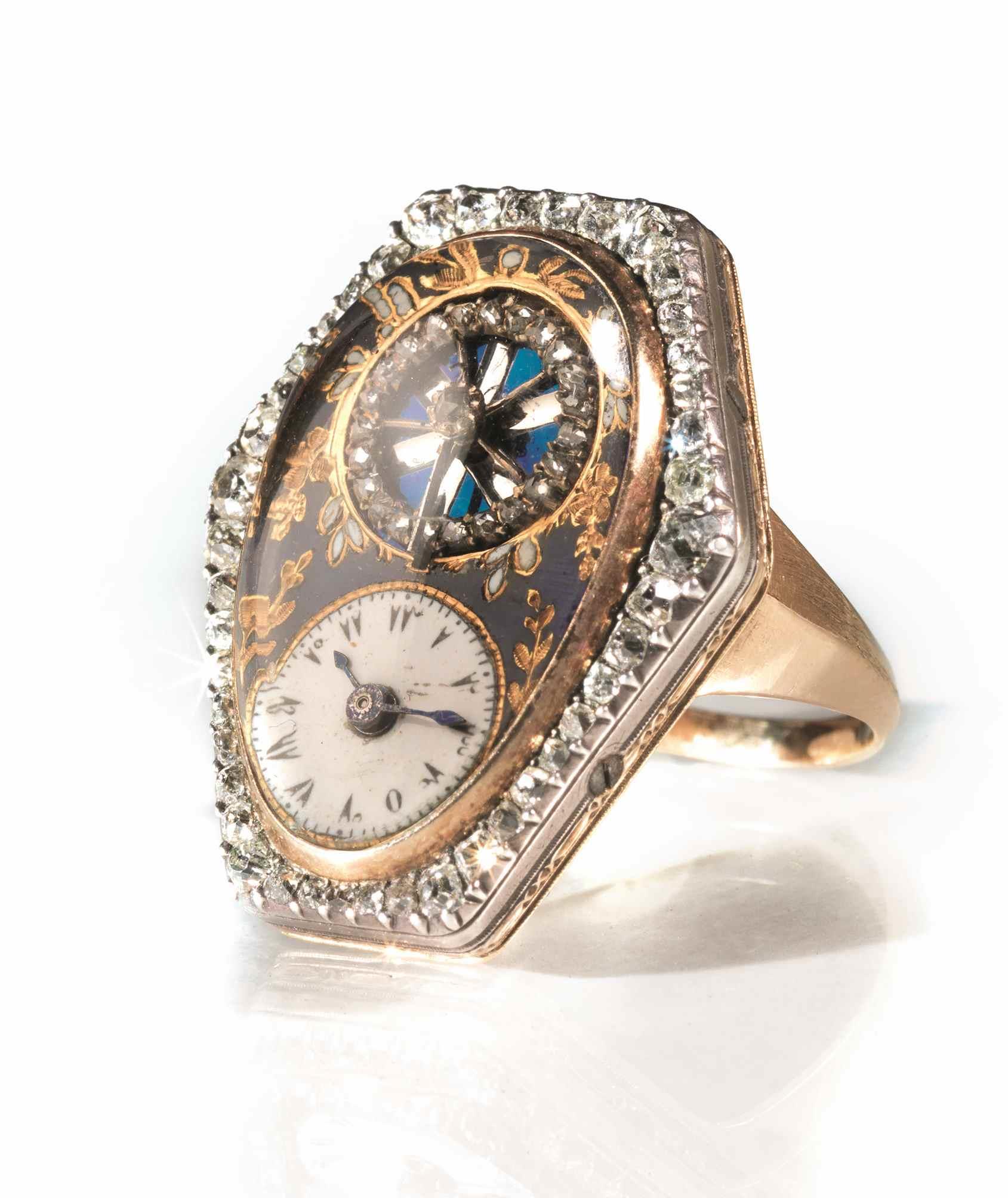 RARO ANELLO OROLOGIO PER IL MERCATO TURCO, 1800 CIRCA, IN ORO GIALLO SMALTO E DIAMANTI