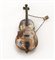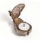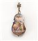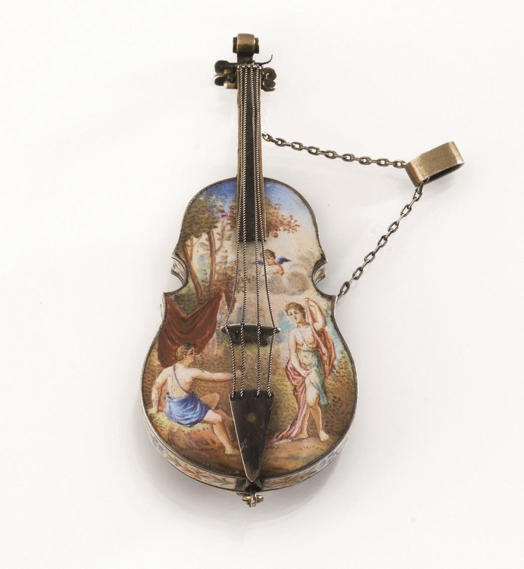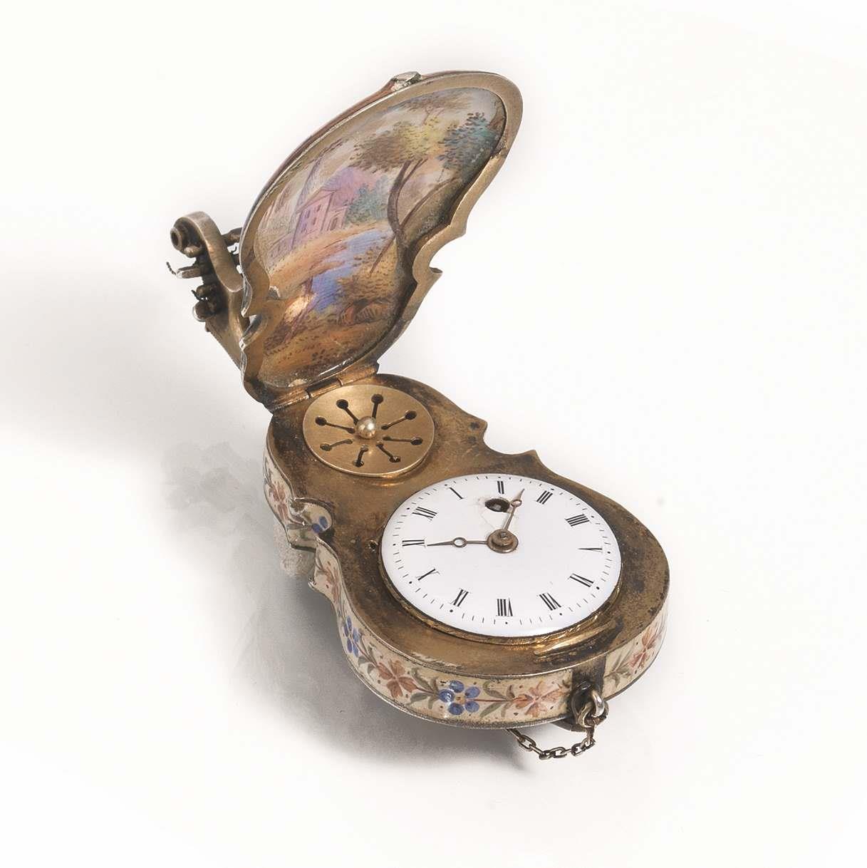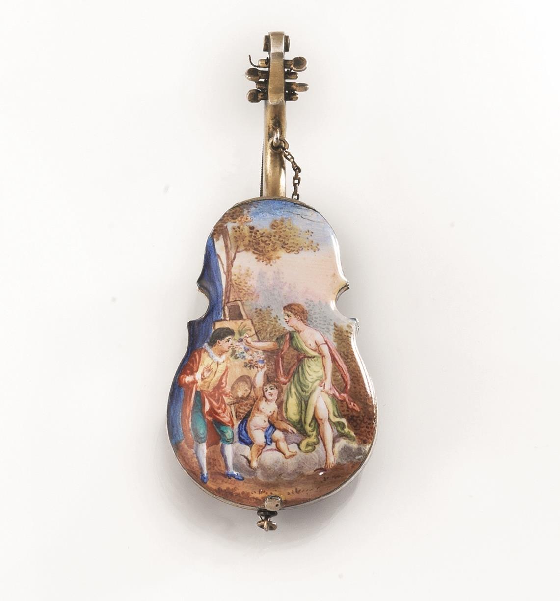 Cassa modellata a violoncello decorata sui due lati da scene di genere in policromia e sulla carrure da motivi floreali, parte posteriore apribile a rivelare nella parte inferiore il quadrante in smalto con numeri romani e lancette traforate con apertura per la carica e la rimessa dell'ora a ore 2, interno del coperchio decorato in smalti policromi a paesaggio fluviale. Movimento con scappamento a verga. Cm 8,2x3,6