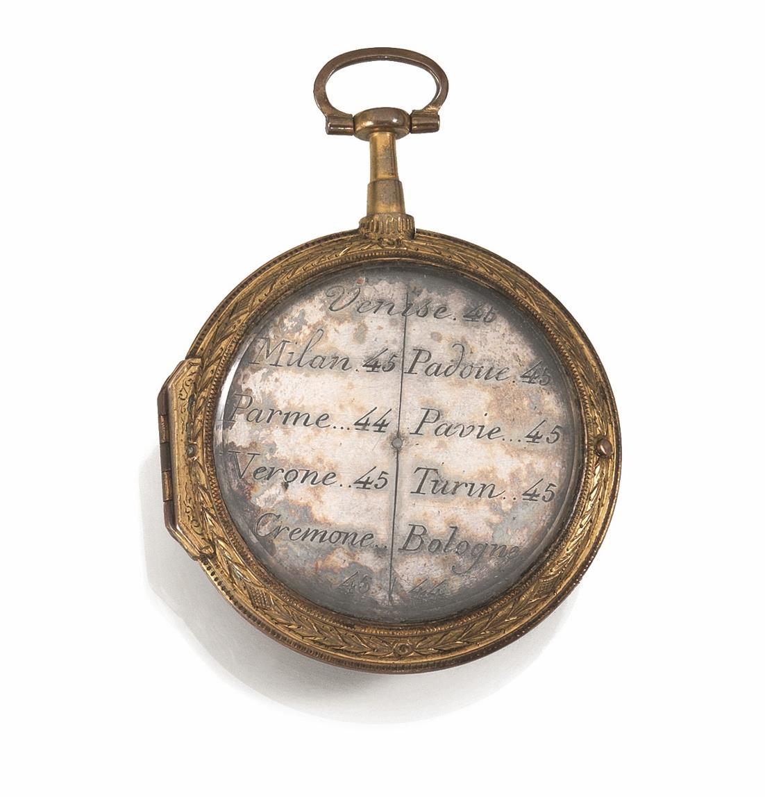 Cassa in ottone dorato cesellato a motivi fogliacei, parte posteriore con disco in argento inciso con latitudini di alcune città italiane. Quadrante con bussola periferica e parte centrale con meridiana per 45° 27' (latitudine di Lione) intercambiabile a seconda della latitudine. Diam. mm 56