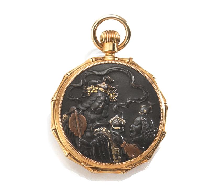 Cassa in oro giallo con carrure cesellata ad imitazione del bambù,nella parte posteriore è montato un medaglione giapponese diforma circolare in rame brunito e dorato cesellato a figura di demone e figura femminile nell’atto di offrire un tributo alla divinità.Quadrante in smalto bianco con numeri romani e minuti in numeri arabi, lancette a foglia e piriforme, secondi al centro. Movimento a carica manuale. Diam mm 38