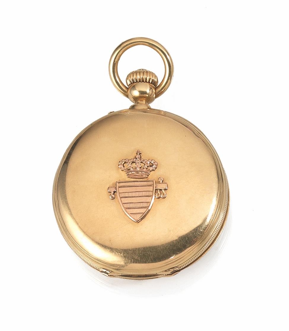 Cassa a 'occhio di bue' con numeri romani in smalto blu e incisione a corolla, sul retro stemma nobiliare a rilievo cesellato. Quadrante in smalto bianco con numeri romani, secondi a ore 6. Movimento a carica manuale. Corredato di catena in oro giallo 18 kt a maglie fantasia con doppio moschettone, g 24