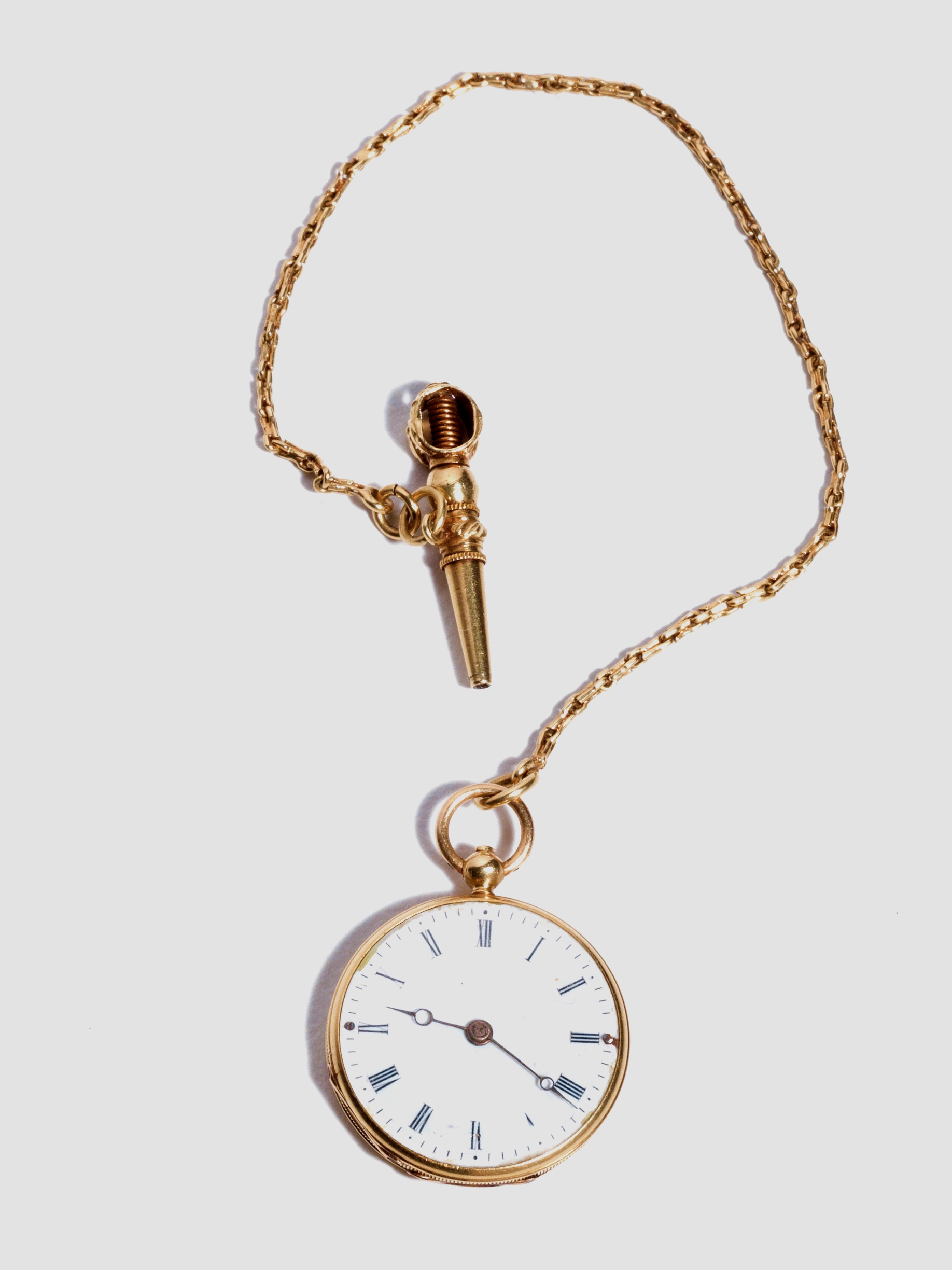 Cassa incisa a volute vegetali con piccolo scudo al centro, carrure rigata, anello a ore 12. Quadrante in smalto con numeri romani, lancette traforate. Movimento con scappamento a cilindro. Corredato di catenella con chiavetta di carica in oro giallo 18 kt e scatola originale rivestita in tartaruga. Diam. mm 18