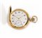 Cassa savonnette in oro liscio, corona di carica a ore 3. Quadrante in smalto bianco con ore antimeridiane in numeri arabi neri e postmeridiane in rosso, secondi a ore 6, lancette piriformi traforate. Movimento a carica manuale firmato e numerato. Diam. mm 52
