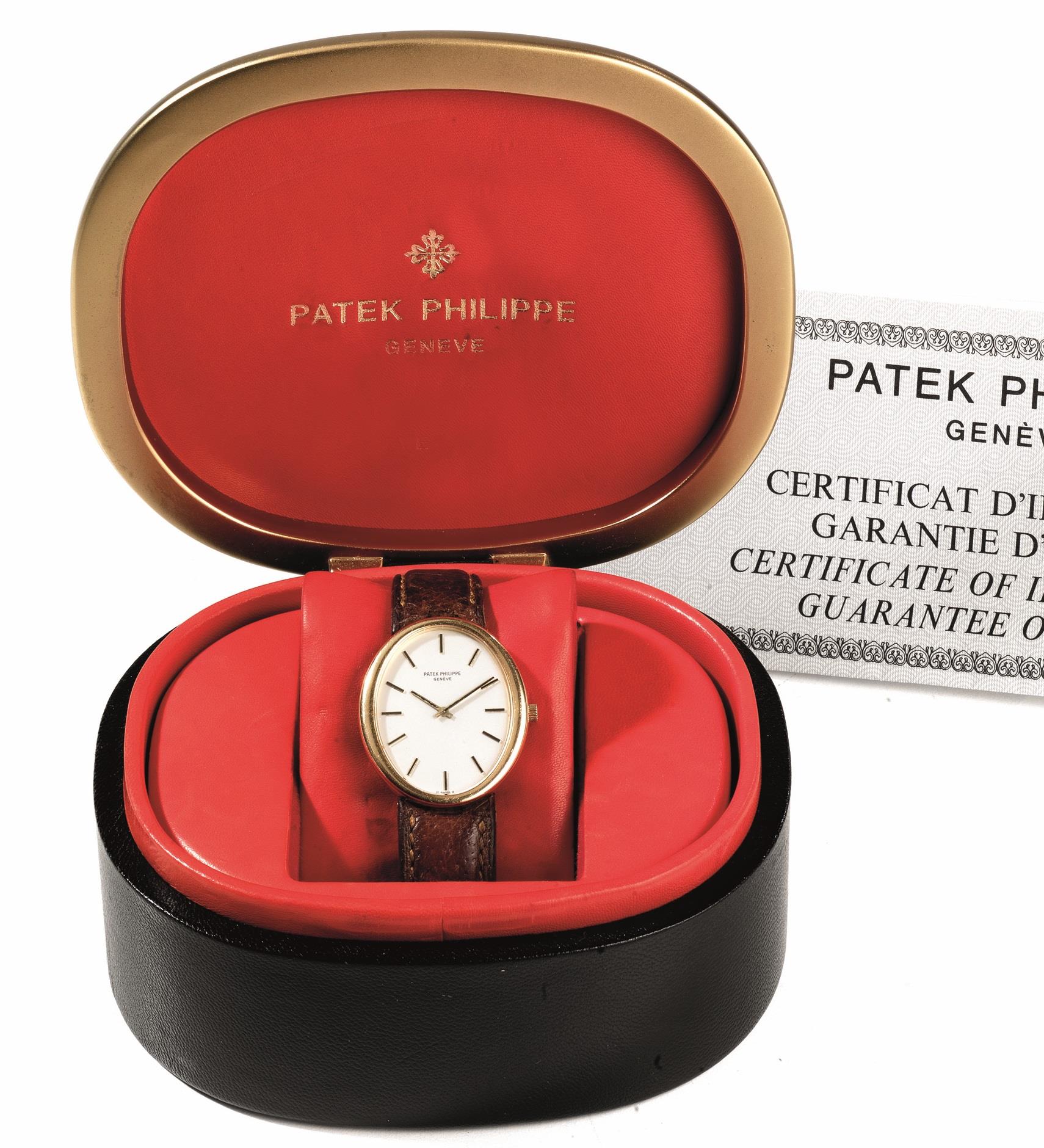 Cassa ovale in due corpi, anse coperte. Quadrante argentè con indici applicati e lancette a bastone. Movimento a carica manuale n. 1'272'685. Cinturino in pelle con fibbia ad ardiglione ovale Patek in oro giallo 18 kt. Dim. mm 35x30