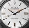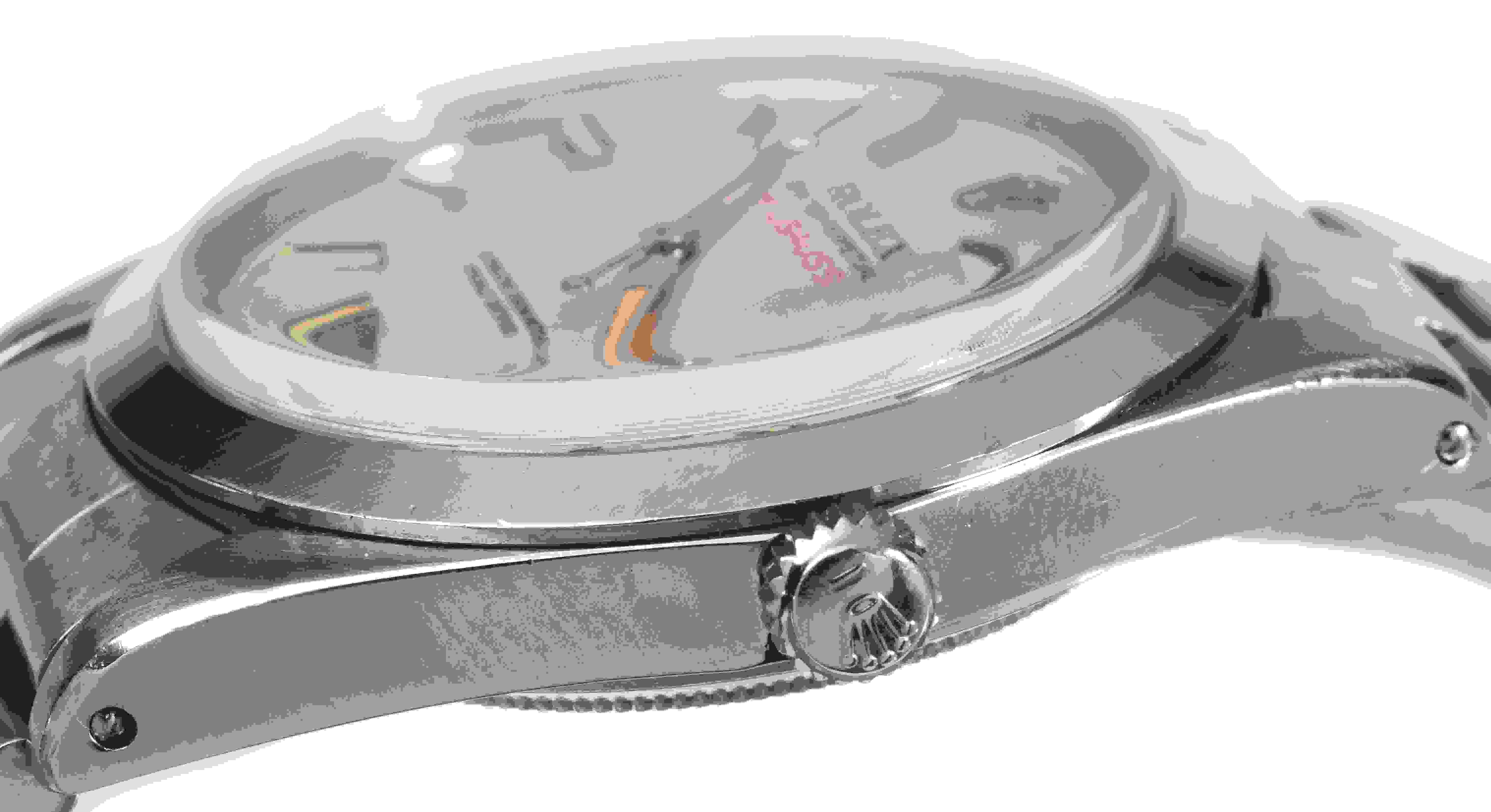 Cassa in tre corpi con fondello e corona a vite, vetro plastica. Quadrante argentè con indici e lancette luminescenti, secondi al centro. Movimento a carica automatica calibro 1580. Bracciale a maglie Oyster, chiusura deployante. Diam. mm 38
